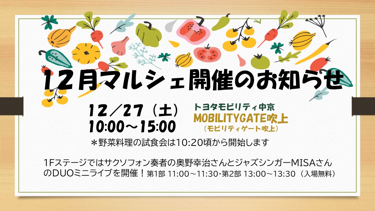 12月27日(土)は今年最後のMGFマルシェ開催日です、今月も新鮮でお値打ちな野菜を沢山仕入れてお待ちしております。この機会にお正月用の野菜をお求めください。好評の名古屋文化短期大学の学生さんが作る野菜料理の試食は10:20頃から。その他、多くのお店やキッチンカーの出店もあります。ステージではサクソフォン奏者の奥野幸治さんとジャズシンガーMISAさんのDUOミニライブを開催します。第1部:11:00~11:30・第2部:13:00~13:30(入場無料)