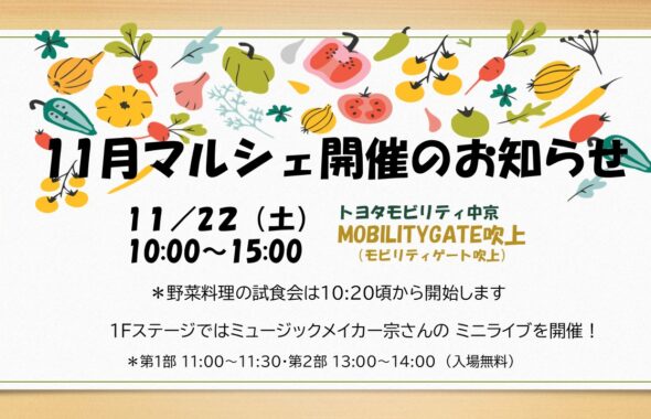 好評の名古屋文化短期大学の学生さんが作る野菜料理の試食会も開催します!今月の野菜はナスです、お楽しみに!