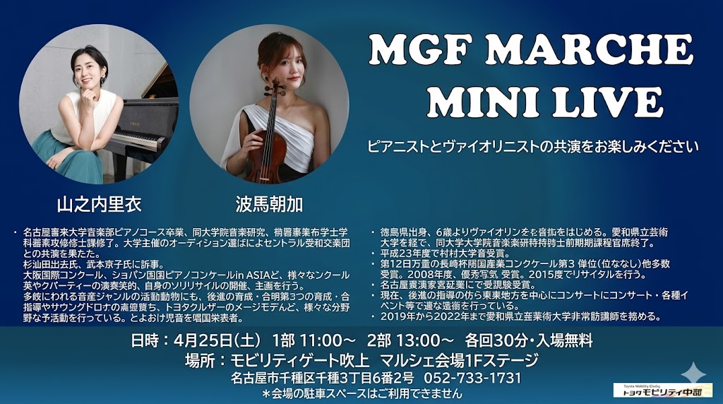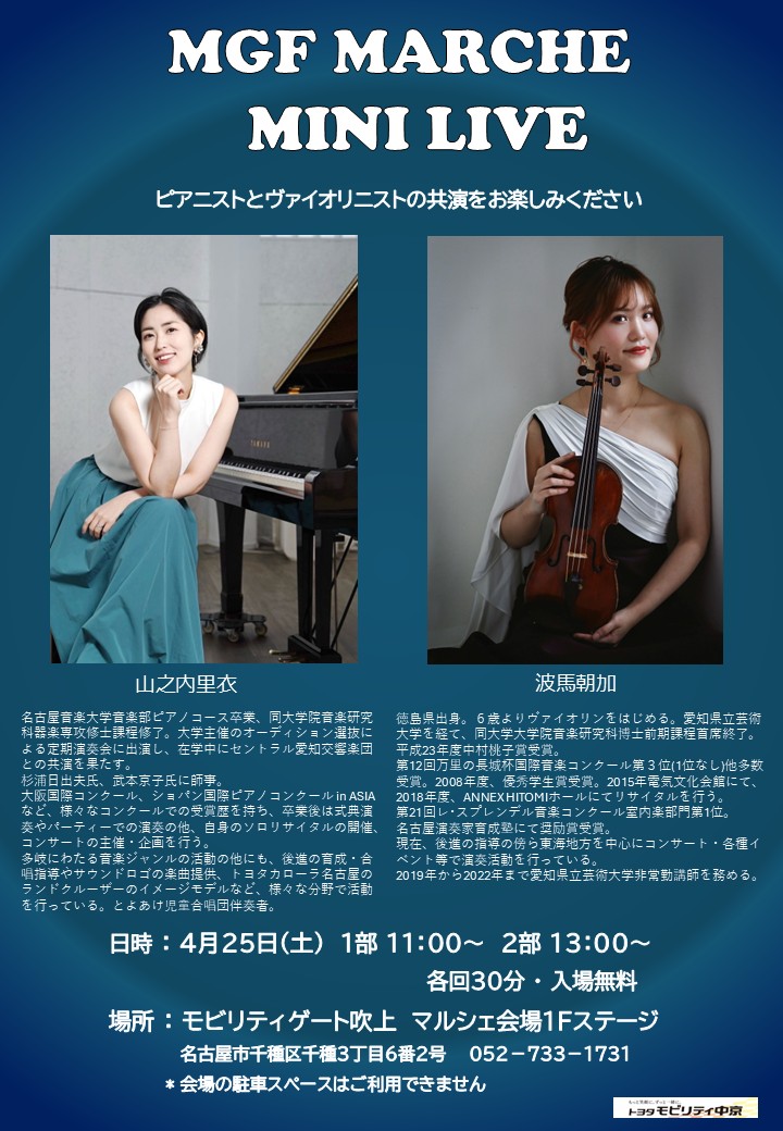 心地よい春のひとときを、美しい音楽とともに過ごしませんか? 今度の「MGF MARCHE(マルシェ)」にて、ピアニスト・山之内里衣さんとヴァイオリニスト・波馬朝加さんによるミニライブを開催いたします!